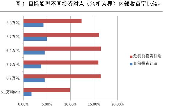 就中遠(yuǎn)期的三大主流船型市場而言,我們一方面要看未來特定市場運(yùn)力供求關(guān)系;另一方面,更要看當(dāng)期投資成本大小和由此帶來的船隊競爭力問題。上述分析已經(jīng)表明,未來較長時期內(nèi)全球各型船舶的船隊均存在運(yùn)力過剩壓力,航運(yùn)費(fèi)率可能會長期在低位徘徊,但是,如果航運(yùn)企業(yè)以當(dāng)前價格投資造船,仍能以較低的投資成本確保相對較高的投資回報率。理由是,一方面,以當(dāng)前成本訂造的新船肯定有很高的市場競爭力;另一方面,在某種程度上也會拉低前幾年高峰期訂造的高價船的單位平均投資成本,提升船隊綜合市場競爭力。以目標(biāo)船型不同投資時點(以危機(jī)爆發(fā)前后為界)內(nèi)部收益率測算比較為例,我們發(fā)現(xiàn),國際金融危機(jī)爆發(fā)后訂造的目標(biāo)船型內(nèi)部收益率均能達(dá)到15%左右的較高水平,而危機(jī)前訂造的目標(biāo)船型內(nèi)部收益率均不足5%。由此可見,當(dāng)前投資優(yōu)勢十分顯著。