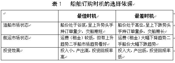 從影響船東選擇船舶訂購時機(jī)的主要因素看,除與公司自身發(fā)展戰(zhàn)略、資金實力和籌集能力等內(nèi)部因素有關(guān)外,還與當(dāng)時造船市場和航運(yùn)市場的狀態(tài)和發(fā)展趨勢,特別是船價和運(yùn)價狀況密切相關(guān)。我們認(rèn)為,航運(yùn)企業(yè)最理想投資訂造新船的時機(jī)是:船價已進(jìn)入谷底并即將上漲,航運(yùn)市場低迷但中長期趨勢看好。