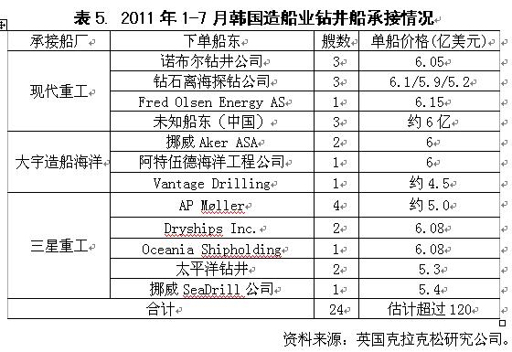 第二,韓國船企基本上壟斷大型海工裝備市場。截至到7月底,全球共有31艘鉆井船成交,除了7艘由巴西南大西洋船廠(三星重工持有該廠股份,并為其提供技術(shù)支持)承接之外,其余船舶均被韓國三大造船集團囊括,總價值金額超過120億美金,相當于220艘18萬噸級好望角型散貨船價值量(當前價)。除鉆井船外,韓國船企還承接了價格不菲的FPSO(浮式生產(chǎn)儲存與卸載系統(tǒng))、FPSO/LNG和FSO(浮式產(chǎn)品儲存與卸載系統(tǒng))訂單。與此形成鮮明對比的是,這一期間其他造船國承接到上述產(chǎn)品卻寥寥無幾。