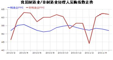 制造業(yè)PMI除3月份短暫回升以外,持續(xù)小幅回落,顯示出經(jīng)濟增速逐漸趨緩。 5月份從11個分項指數(shù)均有不同程度回落,其中,新訂單指數(shù)、積壓訂單指數(shù)、購進價格指數(shù)、原材料庫存指數(shù)回落較明顯,回落幅度超過1個百分點,尤其以購進價格指數(shù)回落幅度為最大,達到5.9個百分點 。