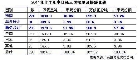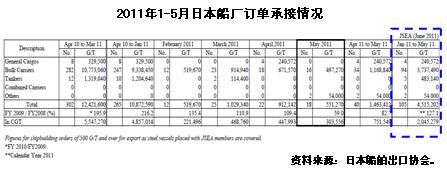 根據(jù)日本造船協(xié)會統(tǒng)計,2011年1-5月日本造船業(yè)承接出口船訂單105艘、205萬修正總噸(較克拉克松公司統(tǒng)計高出150萬修正總噸);