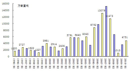 上半年新船成交量超預(yù)期。據(jù)英國克拉克松公司統(tǒng)計(jì),2010年上半年全球累計(jì)成交新船624艘、4751萬載重噸,同比上升369%,其中,第二季度新船成交量明顯放大,月均成交量達(dá)1102萬載重噸,是第一季度平均單月成交量(482萬載重噸)的2.3倍,甚至超過2003-2006年興旺前期月均成交量水平。
