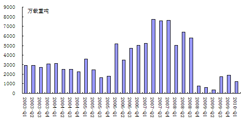 據(jù)英國(guó)克拉克松公司統(tǒng)計(jì),今年第一季度,全球共成交新船164艘、1206.4萬載重噸,較去年同期增長(zhǎng)96.2%。但是,月均成交量?jī)H為402.1萬載重噸,與去年全年月均成交量(385.0萬載重噸)相比僅增長(zhǎng)4.5%,與去年下半年月均成交量(603.2萬載重噸)相比卻下滑33.3%。從上述數(shù)據(jù)來看,一季度市場(chǎng)充其量是2009年下半年以來行情的延續(xù),總的來看,當(dāng)期市場(chǎng)形勢(shì)依舊嚴(yán)峻。