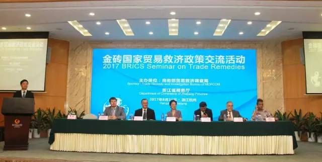 2017年8月31日上午“金磚國(guó)家貿(mào)易救濟(jì)政策交流活動(dòng)會(huì)”在杭州浙江國(guó)際大酒店召開(kāi)。商務(wù)部、商務(wù)廳、各地市商務(wù)局領(lǐng)導(dǎo)、律師專家及預(yù)警點(diǎn)的預(yù)警專員等120人出席了會(huì)議。浙江省分管商務(wù)工作的梁黎明副省長(zhǎng)出席會(huì)議并作了熱情洋溢的致辭。商務(wù)部貿(mào)易救濟(jì)調(diào)查局王賀軍局長(zhǎng),介紹了全國(guó)“二反一保”的形勢(shì),也肯定了浙江省在貿(mào)易救濟(jì)工作中作出的種種努力。尤其是出口預(yù)警示范點(diǎn)工作及“四體聯(lián)動(dòng)”應(yīng)訴工作取得了好的成績(jī)。會(huì)議上半段,由省商務(wù)廳韓杰副廳長(zhǎng)主持會(huì)議。舟山市出口船舶預(yù)警示范點(diǎn)、舟山市出口水產(chǎn) 警示范點(diǎn)預(yù)警專員參加了會(huì)議。