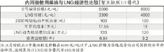 此外,在實(shí)際操作中,目前內(nèi)河船用油價(jià)格比0號(hào)柴油價(jià)格還低,因內(nèi)河航運(yùn)市場會(huì)選擇調(diào)和油作船用燃料,可使燃油成本每噸再下降30%~40%,由此,LNG燃料更失去吸引力。