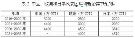 總體市場來看,“十三五”期間,全球經(jīng)濟緩慢復蘇,海運量增長乏力,新船需求將出現(xiàn)明顯萎縮。專家一致認為,年均新船需求在3300萬修正總噸以下。不過,隨著世界經(jīng)濟復蘇,新船需求將有所回升。