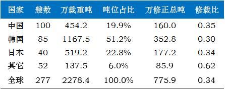 2)目前世界排名前十造船企業(yè)以韓日船廠為主,中國(guó)僅有大船重工一家船廠。