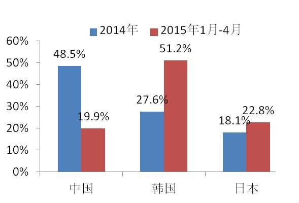 1)2015年1月-4月,中國(guó)、韓國(guó)和日本分別承接訂單454.2萬(wàn)載重噸、1167.5萬(wàn)載重噸和519.2萬(wàn)載重噸,分別占全球份額19.9%、51.2%和22.8%,日韓市場(chǎng)份額較2014年明顯擴(kuò)大,中國(guó)市場(chǎng)份額明顯縮小。