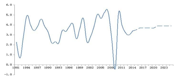 1)IMF在4月份預(yù)測(cè),2015年世界GDP增速3.5%;發(fā)達(dá)經(jīng)濟(jì)體增長(zhǎng)將從2008-2014年的1.3%略升至2015-2020年的1.6%;新興經(jīng)濟(jì)體增長(zhǎng)將從從2008-2014年的6.5%降至2015-2020年的5.2%。