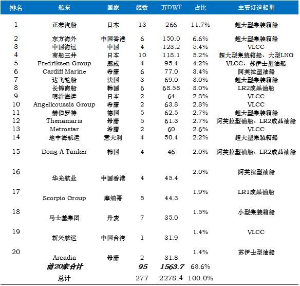 2)2015年1月-4月,全球訂造量前20名船東累計(jì)訂造1563.7萬(wàn)載重噸,總量68.6%,較2014年22.3%水平迅速提升。10500TEU、18000TEU及20150TEU超大型集裝箱船、30.8萬(wàn)噸VLCC等熱點(diǎn)船型的集中成交,是市場(chǎng)集中度迅速提升的主要原因。