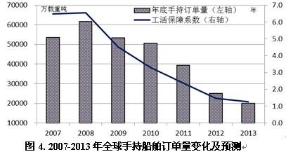 2013年度手持訂單量預(yù)測。按照上述預(yù)測,根據(jù)大致測算公司“期末手持訂單量=期初手持訂單量-期間造船完工量+期間新船訂單量-期間訂單撤銷量”,預(yù)計2012年底全球手持船舶訂單量降至2.5億載重噸,2013年可能進一步跌破2億載重噸。全球造船業(yè)工活保障系數(shù)由2007年6.6年將跌至2012年底1.6年,2013年進一步下滑至1.25年(以1.6億載重噸有效產(chǎn)能測算),預(yù)計2013年全球?qū)⒂懈嗟拇瑥S面臨無船開工的局面。