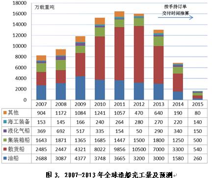 2013年度造船完工量預(yù)測。按手持訂單量交付和后續(xù)訂單交付期安排,同時考慮近幾年訂單未交付情況,預(yù)計2013年約為1.3億載重噸,較上一年下滑15%左右,2014年和2015年將進一步下滑。2013年全球造船產(chǎn)能有效利用率加速下降基本上已成定局。