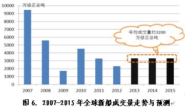 從新船需求來看,近幾年老舊船舶拆解強度顯著加大對“十二五”后三年行情會有很大促進作用,預(yù)計2013-2015年期間年均需求預(yù)計約為3200萬修正總噸,其中,2013年成交量約為2960萬修正總噸,2014-2015年成交量有望進一步放大到3500萬修正總噸左右。