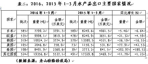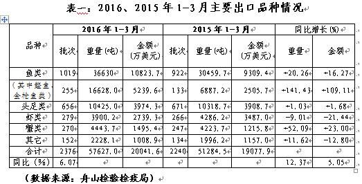 “十三五”規(guī)劃開局之年的開局之季,2016年1-3月舟山市水產(chǎn)品對(duì)外貿(mào)易迎來了開門紅,出口批次、出口量及出口額全線飄紅,一舉扭轉(zhuǎn)了2015年下降態(tài)勢(shì)。