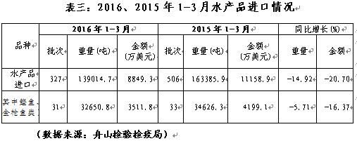 2016年1-3月舟山水產(chǎn)品進(jìn)口下降,具體見表三: