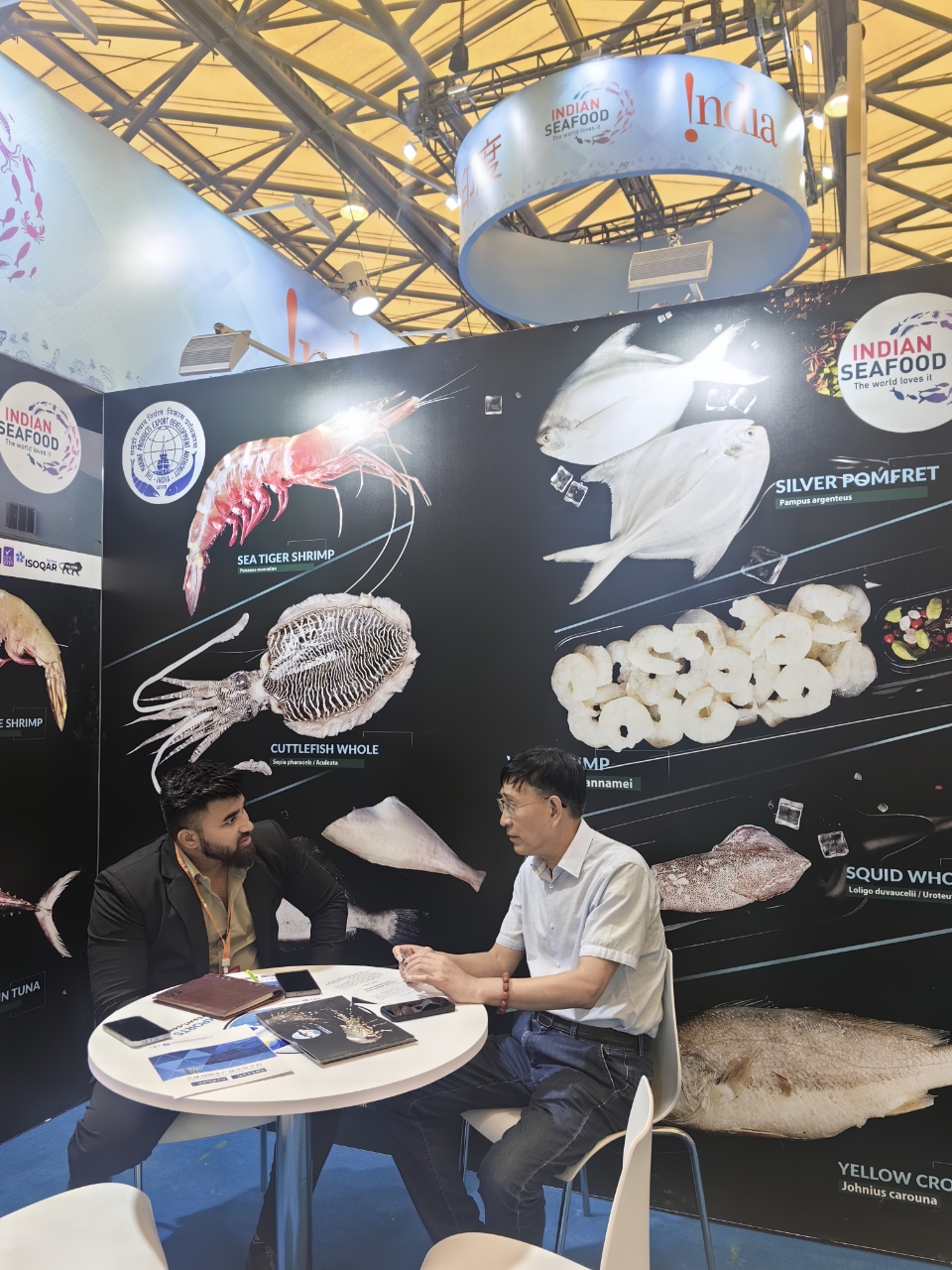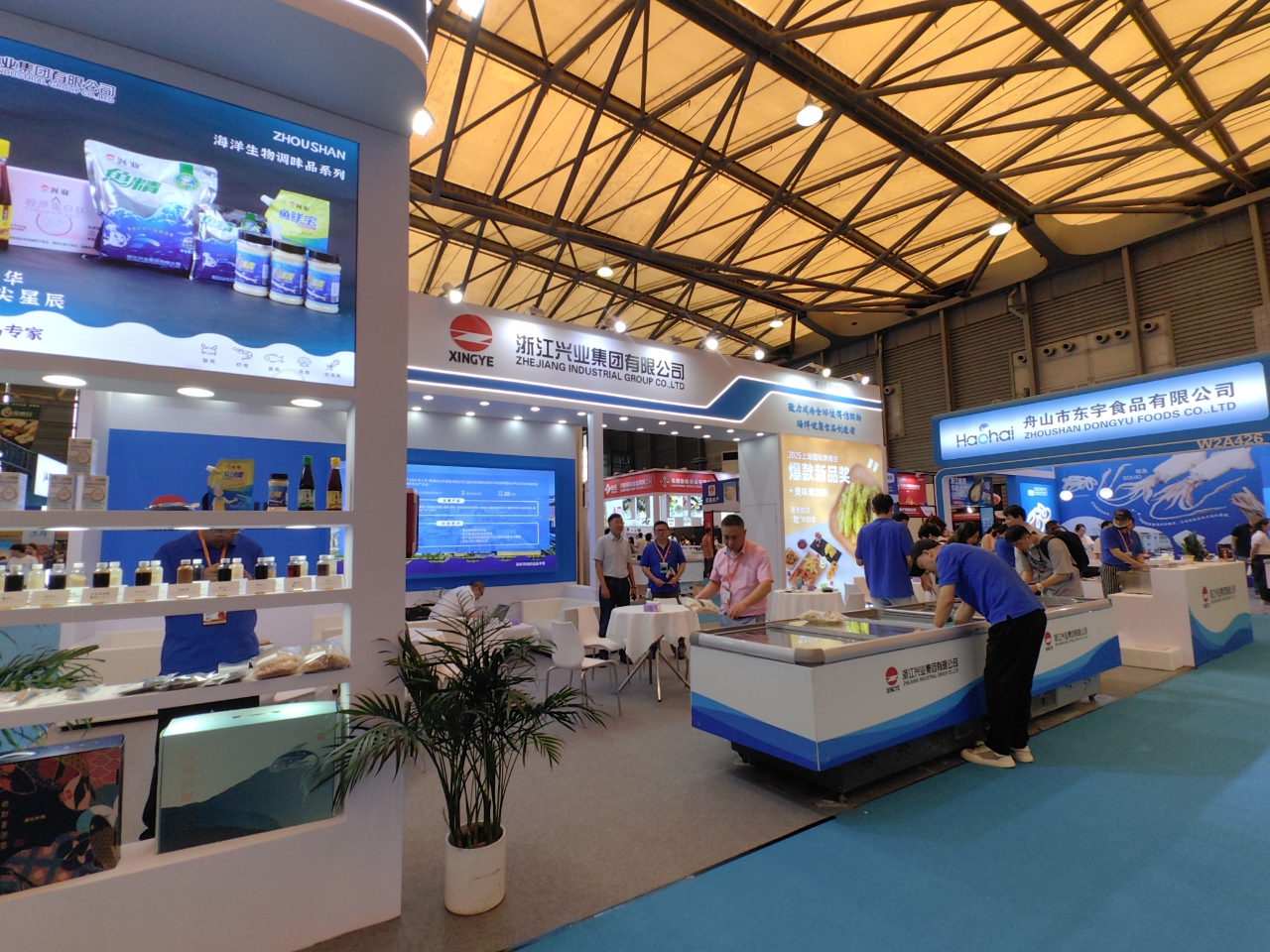 陳國強副會長先后走訪了多家來自舟山的漁業(yè)企業(yè)展位,深入了解企業(yè)在產品研發(fā)、市場拓展、出口貿易等方面的最新動態(tài),并與協(xié)會理事單位浙江興業(yè)集團有限公司的展位負責人進行了深入交流。興業(yè)集團本身實力雄厚,是國家高新技術企業(yè),農業(yè)產業(yè)化國家重點龍頭企業(yè),全國農產品加工業(yè)出口示范企業(yè)。興業(yè)集團已連續(xù)3年參加上海漁博會,通過這一國際性平臺,興業(yè)集團成功吸引了大量國內外采購商的關注,獲得了穩(wěn)定的訂單增長,拓展了客戶資源,提升了品牌知名度。展會期間,興業(yè)集團展示了多款優(yōu)質水產品及創(chuàng)新加工產品,吸引了眾多專業(yè)買家駐足洽談,現場氣氛熱烈。